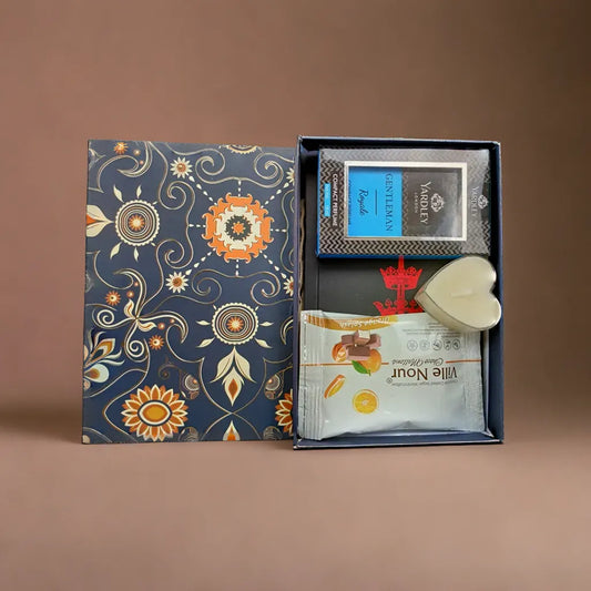 Mini hamper with hot cocoa, men's pocket perfume and chocolate peanut laddoo