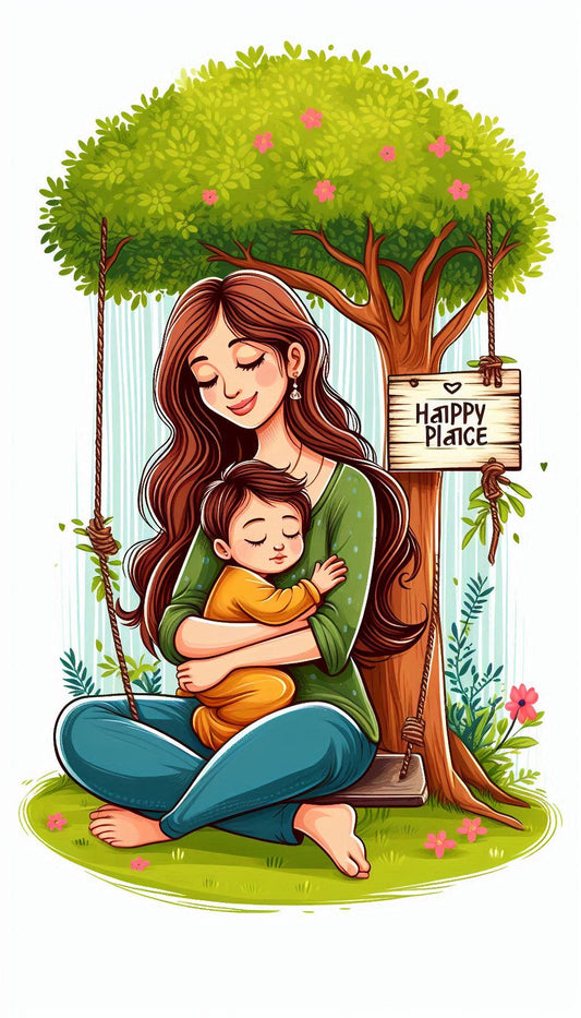Happy Place Poster/Painting/Wall Art with Frame - Mom and Baby Illustration Outdoors
