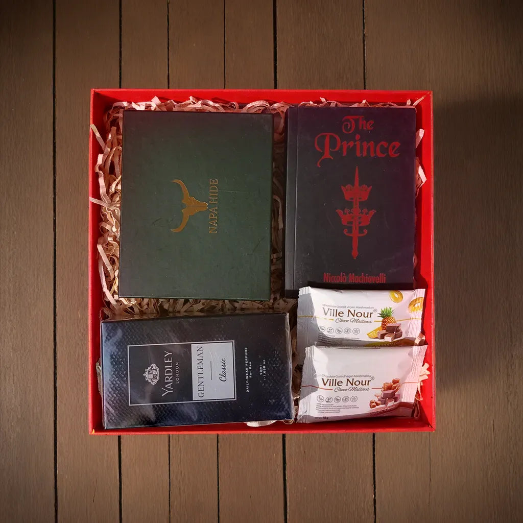 Indulge yourself or a loved one with the Magnificent gift set. This premium box includes a luxurious Napa Hide wallet, Yardley Gentlemen Perfume, a Pocket Classic book, and two vegan marshmallows. Treat yourself to the ultimate gift of sophistication and comfort!