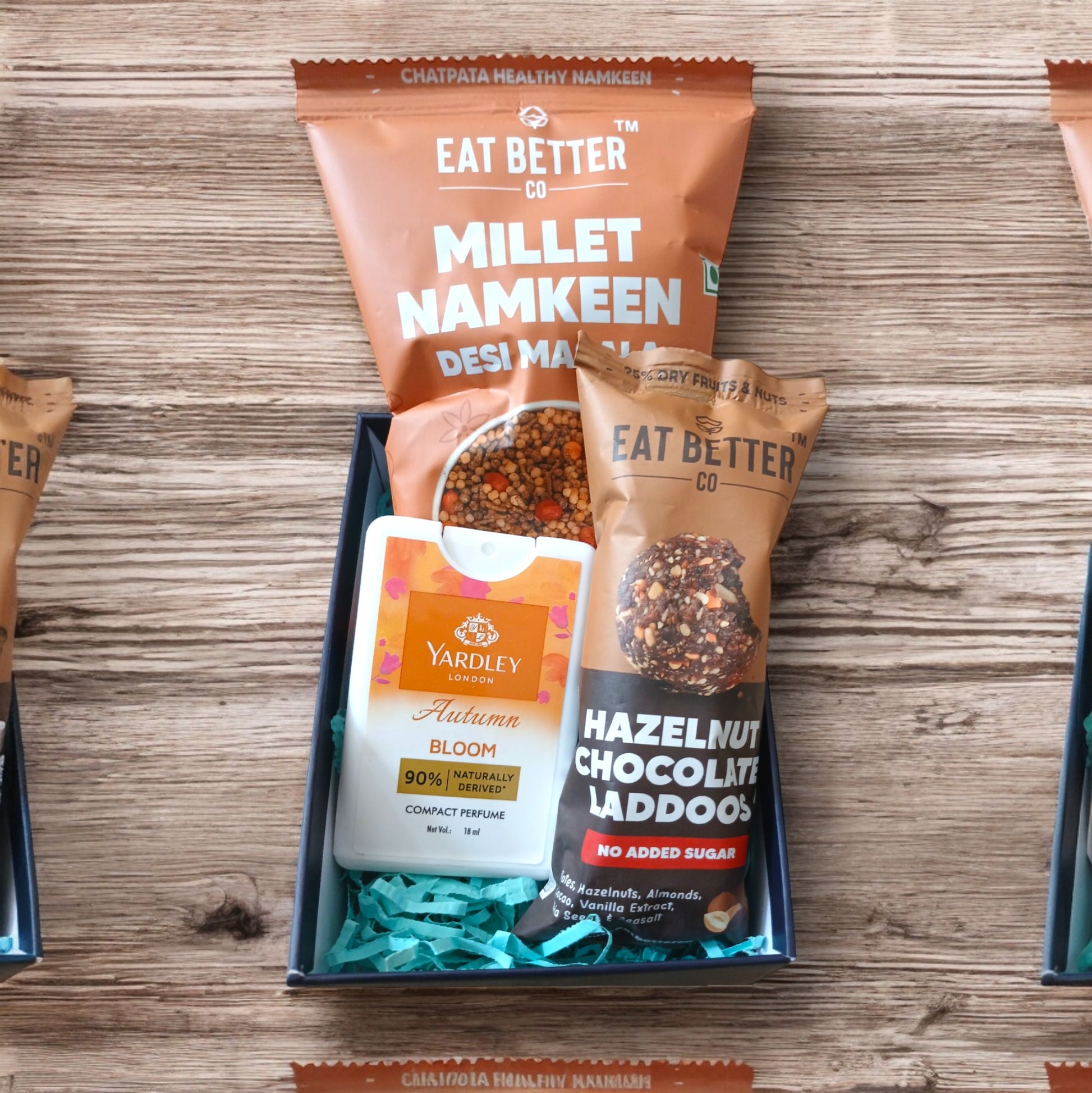 Mini hamper with Millet Namkeen, women's pocket perfume and chocolate hazelnut laddoo